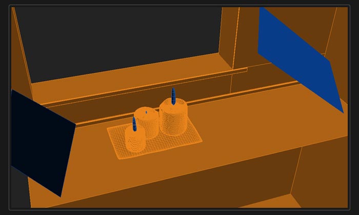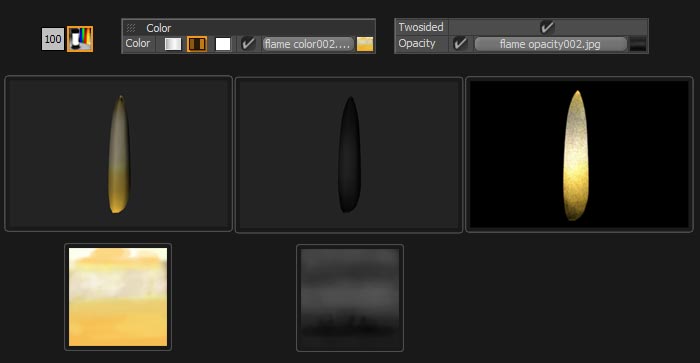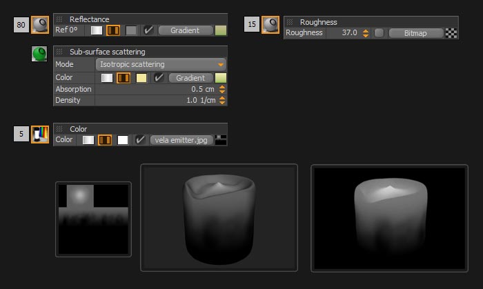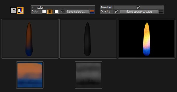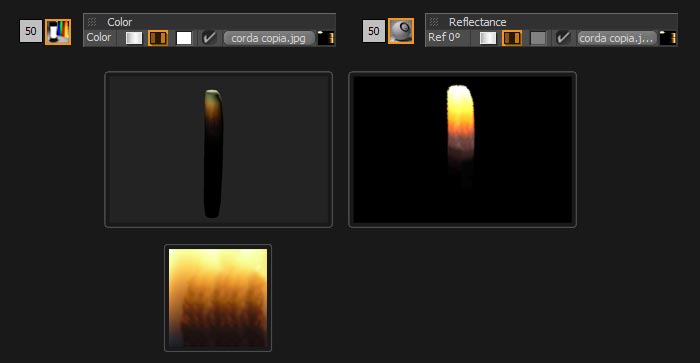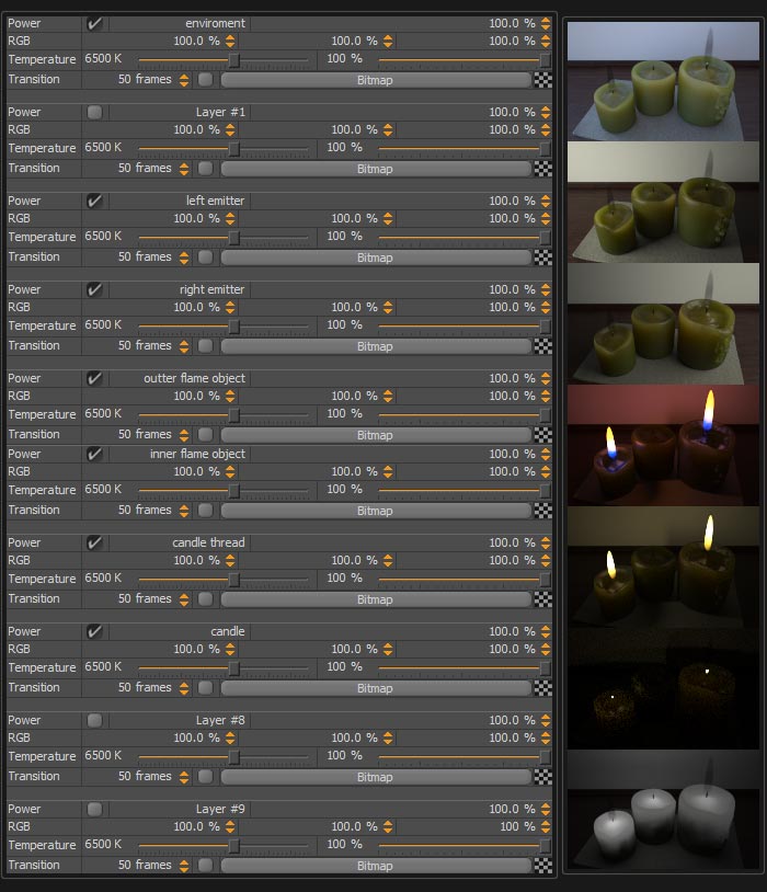 Finally, adjust the emitter values using layer blending. If you want to optimize the render memory for a big scene, you can attach the flames and candle thread with one object and control with one layer, but remember to adjust previously the power and the colors of this emitters.